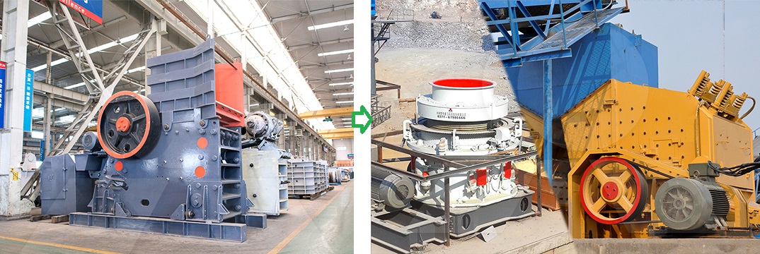 先由振動給料機去除不合格的物料,將合格物料送入顎破進行初步破碎,再由皮帶機送入圓錐破或者反擊破中進行二次破碎。