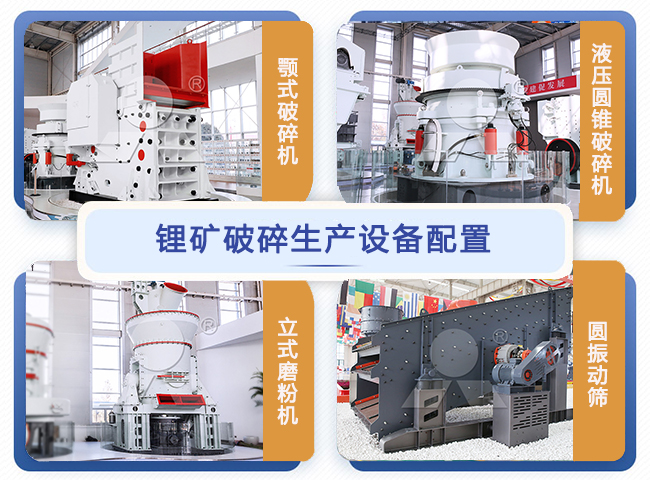 鋰礦石原料進入顎式破碎機進行破碎,破碎后的石料送入到液壓圓錐破碎機進行粗碎,粗碎后經圓振動篩篩分后,成品粒度達不到要求的再進入細碎圓錐破碎機進行細碎,細碎后經過篩分0-15mm成品后直接進入立磨或者球磨機進行研磨。