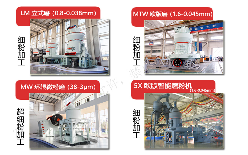 注:細粉加工一般選用LM立式輥磨機、MTW歐版磨機、5X歐版智能磨粉機;超細粉加工一般選用LUM超細立式磨機、MW環輥微粉磨粉機,粗粉加工選用CM歐式粗粉磨、直通式離心磨。
