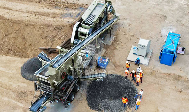 履帶配置的移動碎石制沙作業現場,可完成給料、制砂、篩分一體化作業